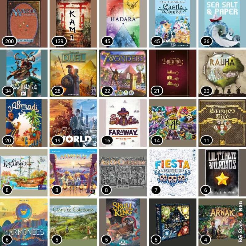 Je ne compte pas les parties de jeu faites lors des festivals car ça serait trop compliqué. Je catégorise par contre les parties faites sur BGA, des parties de MTGA et des parties faites en physique (à la maison ou lors de nos soirées du Jeudi). Cette année aura été une petite année en physique, entre mon boulot qui m'a pris beaucoup de temps (entre les heures à rallonge et mon arrêt...) mais aussi parce que peu de temps pour jouer avec ma fille qui a beaucoup bossé pour ses études. Par contre ça aura été une grosse année BGA (BoardGame Arena) et plutôt assez active sur MTGA (Magic The Gathering Arena)